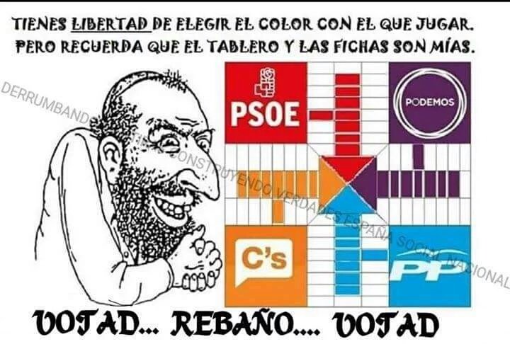 Desgraciadamente, el pueblo español sigue mayoritariamente sin darse cuenta de que en esto de las elecciones, como en otras tantas cosas, el sistema te dice: jugad a mi juego, jugad, jugad a elegir que ficha gana la partida, la azul descolorida del PP, la roja del PSOE, la naranja de Ciudadanos, o la morada de Podemos, jugad, pero recordad que el tablero es mío y las fichas también, y que del juego saldrá lo que yo quiero que salga o no se juega y me invento otro juego.